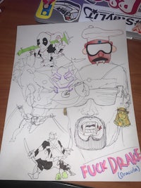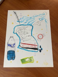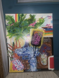 a painting of a laptop and other items on a table